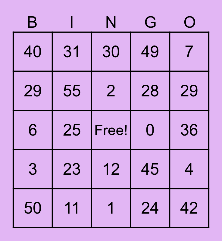 This bingo card has a free space and 24 words: 23, 11, 2, 50, 7, 40, 29, 31, 0, 12, 28, 6, 45, 4, 55, 24, 36, 30, 29, 25, 42, 3, 49 and 1.
