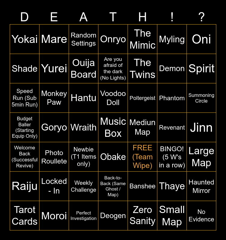 This bingo card has a free space and 48 words: Banshee, Demon, Deogen, Goryo, Hantu, Jinn, Mare, Moroi, Myling, Obake, Oni, Onryo, Phantom, Poltergeist, Raiju, Revenant, Shade, Spirit, Thaye, The Mimic, The Twins, Wraith, Yokai, Yurei, Haunted Mirror, Ouija Board, Summoning Circle, Tarot Cards, Voodoo Doll, Monkey Paw, Small Map, Mediun Map, Large Map, Locked - In, Budget Baller (Starting Equip Only), FREE (Team Wipe), BINGO! (5 W's in a row), Speed Run (Sub 5min Run), Newbie (T1 Items only), Weekly Challenge, Welcome Back (Successful Revive), No Evidence, Random Settings, Perfect Investigation, Are you afraid of the dark (No Lights), Back-to-Back (Same Ghost / Map), Photo Roullete and Zero Sanity.