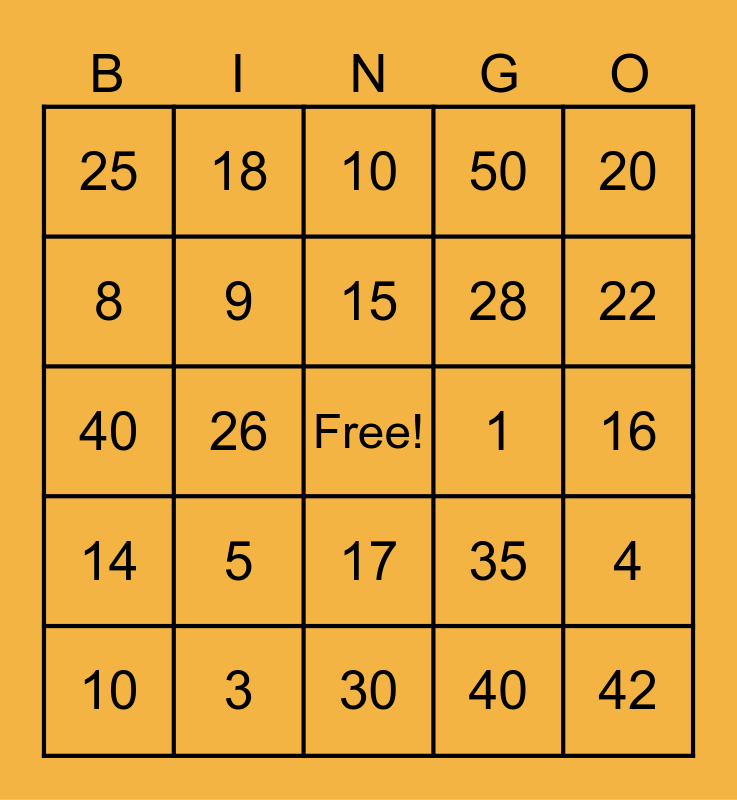 This bingo card has a free space and 24 words: 5, 3, 15, 10, 20, 25, 8, 18, 1, 17, 28, 40, 35, 4, 9, 40, 16, 10, 22, 26, 42, 14, 50 and 30.
