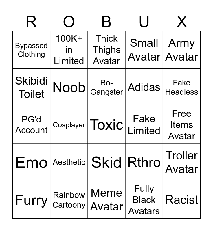 This bingo card has 30 words: Furry, Trans /Femboy, Ro-Gangster, Bacon Hair, Army Avatar, Bypassed Clothing, 100K+ in Limited, Skid, Fake Limited, Racist, Emo, Noob, ODers, Fully Black Avatars, Troller Avatar, Spammer, Cosplayer, Toxic, Rthro, Fake Headless, PG'd Account, Rainbow Cartoony, Thick Thighs Avatar, Adidas, Free Items Avatar, Skibidi Toilet, Aesthetic, Meme Avatar, Small Avatar and Slender/C&P.