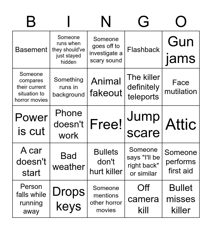 This bingo card has a free space and 27 words: Someone says "I'll be right back" or similar, The killer comes back from seemingly being killed, The killer definitely teleports, Someone mentions other horror movies, Someone compares their current situation to horror movies, Someone goes off to investigate a scary sound, Someone runs when they should've just stayed hidden, A car doesn't start, Jump scare, Someone performs first aid, Power is cut, Flashback, Person falls while running away, Drops keys, Face mutilation, Someone breaks their leg, Something runs in background, Animal fakeout, Bad weather, Basement, Attic, Off camera kill, Phone doesn't work, Bullet misses killer, Bullets don't hurt killer, Gun jams and Kid dies.