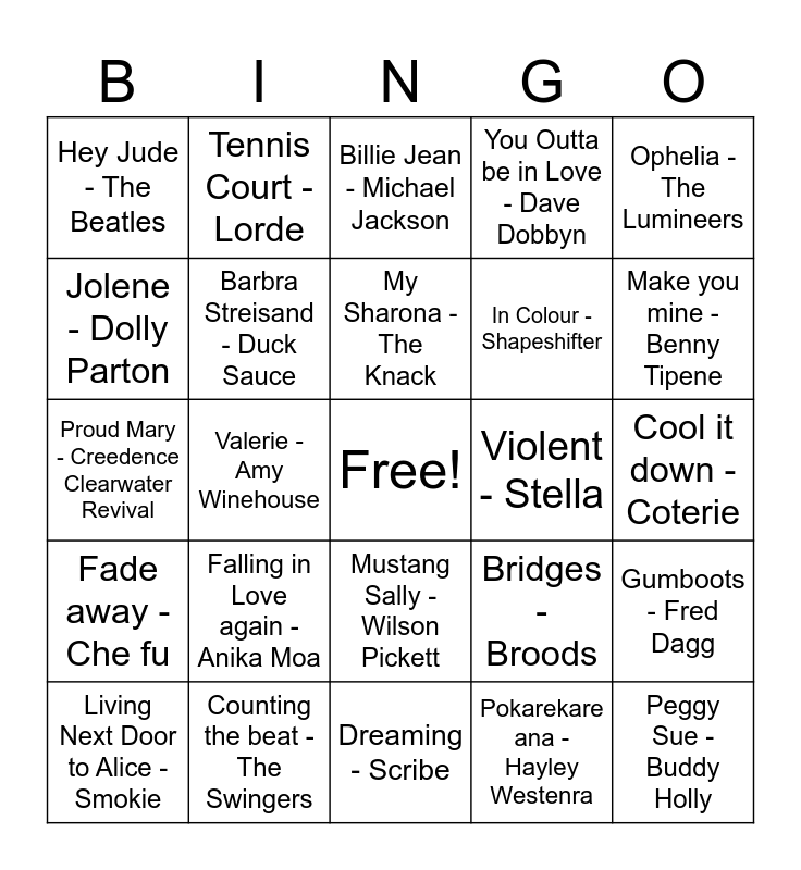 This bingo card has a free space and 76 words: Gloria - Laura Branigan, Bette Davis Eyes - Kim Carnes, Billie Jean - Michael Jackson, Roxanne - The Police, Sherry - Four Seasons, Sweet Caroline - Neil Diamond, Stacy’s Mom - Fountains of Wayne, Kelsey - Metro Station, Victoria - Dance Exponents, Come on Eileen - Dexy Midnight Runners, Rhiannon - Fleetwood Mac, Cecilia - Simon and Garfunkel, My Sharona - The Knack, Jolene - Dolly Parton, Lola - The Kinks, Valerie - Amy Winehouse, Breakfast at Tiffany’s - Deep Blue Tiffany, Peggy Sue - Buddy Holly, Sandy - John Travolta, Ophelia - The Lumineers, Hey there Delilah - Plain White tee’s, Proud Mary - Creedence Clearwater Revival, Barbra Streisand - Duck Sauce, Tennis Court - Lorde, You Outta be in Love - Dave Dobbyn, Firefly - Drax Project, Gutter Black - Hello Sailor, April Sun in Cuba - Dragon, Glitter - Benee, It’s on - Nesian Mystik, Black Sheep - Gin Wigmore, Larger than life - The Feelers, All she wrote - Six60, Bridges - Broods, Make you mine - Benny Tipene, In Colour - Shapeshifter, Sway - Bic Runga, Everything - P Money, Cool it down - Coterie, Pokarekare ana - Hayley Westenra, Bliss - th Dudes, They can’t Take that away - Ben Lummis, Fast times in Tahoe - Elemeno P, Untouchable Girls - Topp Twins, Pacifier - Shihad, Anchor me - The Mutton Birds, Living Next Door to Alice - Smokie, Hey Jude - The Beatles, Black Betty - Ram Jam, Bennie and the jets - Elton John, Janie’s got a Gun - Aerosmith, Mustang Sally - Wilson Pickett, Reet Petite - Jackie Wilson, Venus - The Feelers, Roxanne - Arizona Zervas, Sophie - Goodshirt, Grace Kelly - Mika, Jessie’s girl - Rick Springfield, Mandy - Barry Manilow, I’ve got - Fast crew, Falling in Love again - Anika Moa, Weather with you - Crowded House, Business time - Flight of the conchords, Northern Lights - Golden horse, Don’t worry bout it - Kings, I see red - Split endz, Violent - Stella, Why oh Why - LAB, Walkie talkie man - Steriogram, Everything’s gonna be alright - The Babysitters Circus, Gumboots - Fred Dagg, Fade away - Che fu, Counting the beat - The Swingers, Ghetto Flower - J Williams, Dreaming - Scribe and Slings and arrows - Fat Freddy’s drop.