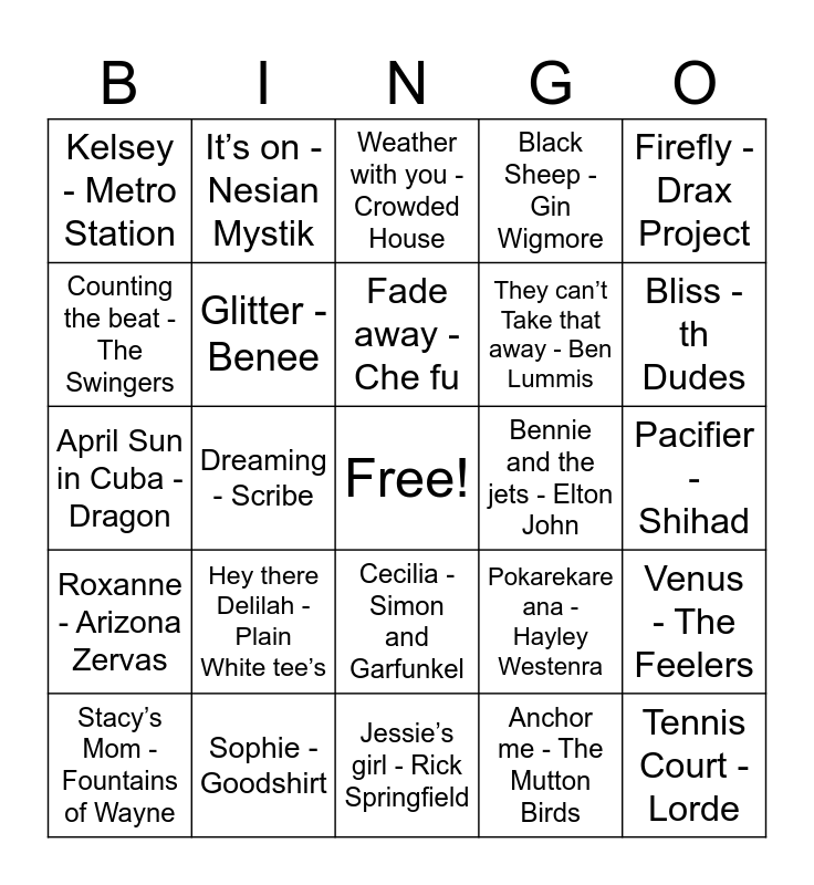 This bingo card has a free space and 76 words: I’ve got - Fast crew, Falling in Love again - Anika Moa, Weather with you - Crowded House, Business time - Flight of the conchords, Northern Lights - Golden horse, Don’t worry bout it - Kings, I see red - Split endz, Violent - Stella, Why oh Why - LAB, Walkie talkie man - Steriogram, Everything’s gonna be alright - The Babysitters Circus, Gumboots - Fred Dagg, Fade away - Che fu, Counting the beat - The Swingers, Ghetto Flower - J Williams, Dreaming - Scribe, Slings and arrows - Fat Freddy’s drop, Tennis Court - Lorde, You Outta be in Love - Dave Dobbyn, Firefly - Drax Project, Gutter Black - Hello Sailor, April Sun in Cuba - Dragon, Glitter - Benee, It’s on - Nesian Mystik, Black Sheep - Gin Wigmore, Larger than life - The Feelers, All she wrote - Six60, Bridges - Broods, Make you mine - Benny Tipene, In Colour - Shapeshifter, Sway - Bic Runga, Everything - P Money, Cool it down - Coterie, Pokarekare ana - Hayley Westenra, Bliss - th Dudes, They can’t Take that away - Ben Lummis, Fast times in Tahoe - Elemeno P, Untouchable Girls - Topp Twins, Pacifier - Shihad, Anchor me - The Mutton Birds, Gloria - Laura Branigan, Bette Davis Eyes - Kim Carnes, Billie Jean - Michael Jackson, Roxanne - The Police, Sherry - Four Seasons, Sweet Caroline - Neil Diamond, Stacy’s Mom - Fountains of Wayne, Kelsey - Metro Station, Victoria - Dance Exponents, Come on Eileen - Dexy Midnight Runners, Rhiannon - Fleetwood Mac, Cecilia - Simon and Garfunkel, My Sharona - The Knack, Jolene - Dolly Parton, Lola - The Kinks, Valerie - Amy Winehouse, Breakfast at Tiffany’s - Deep Blue Tiffany, Peggy Sue - Buddy Holly, Sandy - John Travolta, Ophelia - The Lumineers, Hey there Delilah - Plain White tee’s, Proud Mary - Creedence Clearwater Revival, Barbra Streisand - Duck Sauce, Living Next Door to Alice - Smokie, Hey Jude - The Beatles, Black Betty - Ram Jam, Bennie and the jets - Elton John, Janie’s got a Gun - Aerosmith, Mustang Sally - Wilson Pickett, Reet Petite - Jackie Wilson, Venus - The Feelers, Roxanne - Arizona Zervas, Sophie - Goodshirt, Grace Kelly - Mika, Jessie’s girl - Rick Springfield and Mandy - Barry Manilow.