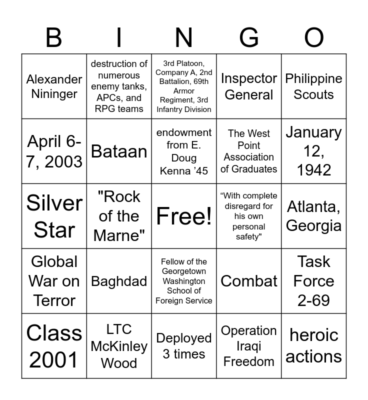 This bingo card has a free space and 24 words: Baghdad, LTC McKinley Wood, endowment from E. Doug Kenna ’45, Class 2001, Philippine Scouts, Alexander Nininger, April 6-7, 2003, destruction of numerous enemy tanks, APCs, and RPG teams, “With complete disregard for his own personal safety", Fellow of the Georgetown Washington School of Foreign Service, The West Point Association of Graduates, Silver Star, Combat, Task Force 2-69, Bataan, Operation Iraqi Freedom, Atlanta, Georgia, 3rd Platoon, Company A, 2nd Battalion, 69th Armor Regiment, 3rd Infantry Division, January 12, 1942, "Rock of the Marne", heroic actions, Global War on Terror, Inspector General and Deployed 3 times.