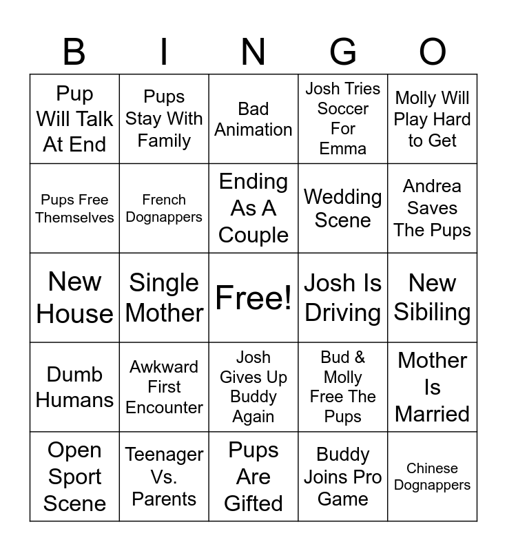 This bingo card has a free space and 24 words: Open Sport Scene, Awkward First Encounter, Ending As A Couple, Buddy Joins Pro Game, Molly Will Play Hard to Get, Pup Will Talk At End, Pups Stay With Family, Bad Animation, Josh Is Driving, New Sibiling, New House, French Dognappers, Bud & Molly Free The Pups, Mother Is Married, Pups Free Themselves, Teenager Vs. Parents, Pups Are Gifted, Josh Tries Soccer For Emma, Andrea Saves The Pups, Dumb Humans, Single Mother, Josh Gives Up Buddy Again, Wedding Scene and Chinese Dognappers.
