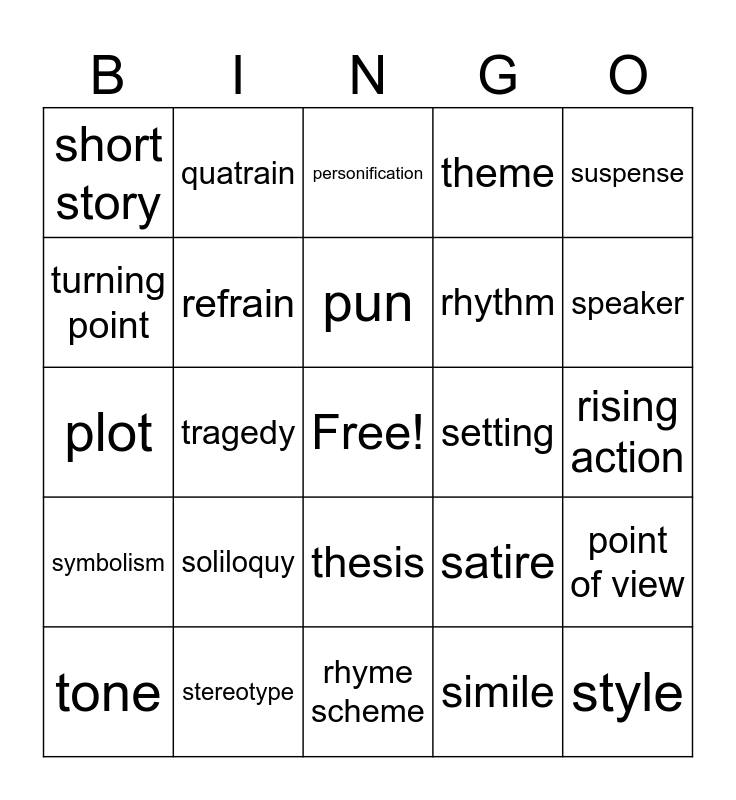 This bingo card has a free space and 24 words: soliloquy, stereotype, pun, tone, suspense, short story, turning point, quatrain, setting, thesis, rhythm, plot, satire, point of view, refrain, simile, rising action, personification, speaker, tragedy, style, symbolism, theme and rhyme scheme.