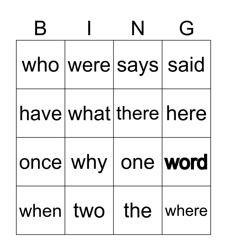 This bingo card has 16 words: two, word, says, who, once, were, one, the, have, what, when, said, why, here, there and where.
