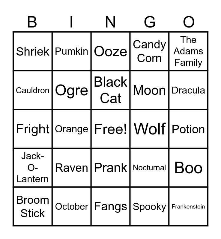 This bingo card has a free space and 39 words: Owl, Spider, Treats, Ogre, Broom Stick, Prank, Black Cat, Autumn, The Adams Family, Jack-O-Lantern, Orange, Candy Corn, Frankenstein, Potion, Wolf, Raven, Hocus Pocus, Shriek, Bats, Nocturnal, Cauldron, Fangs, Moon, Dracula, Mummy, Spider Web, Fog, Eerie, Scare Crow, Pumkin, Hayride, Ghost Busters, Ooze, October, Spooky, Hotel Transylvania, Boo, Fright and Costume.