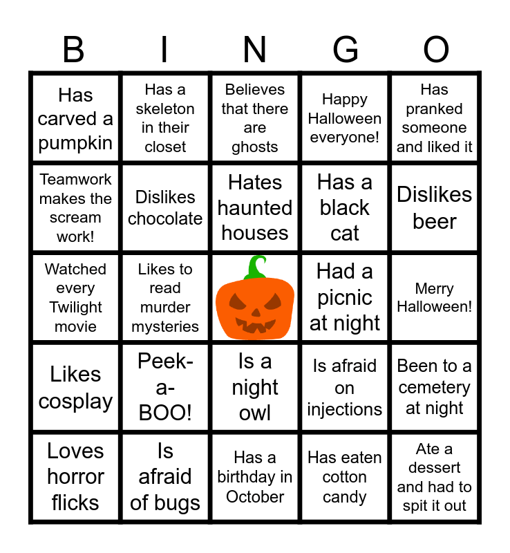 This bingo card has a free space and 30 words: Loves horror flicks, Has never been trick-or-treating, Hates haunted houses, Has eaten an entire tub of ice-cream in 1 go, Has pranked someone and liked it, Has carved a pumpkin, Has a skeleton in their closet, Is a night owl, Had a picnic at night, Ate a dessert and had to spit it out, Likes cosplay, Dislikes chocolate, Never watched a horror movie, Has eaten cotton candy, Been to a cemetery at night, Loves haunted houses, Likes to read murder mysteries, Has a birthday in October, Is afraid on injections, Dislikes beer, Watched every Twilight movie, Is afraid of bugs, Believes that there are ghosts, Has a black cat, Merry Halloween!, Teamwork makes the scream work!, Peek-a-BOO!, Free Broom Rides, Happy Halloween everyone! and Oh my gourd!.