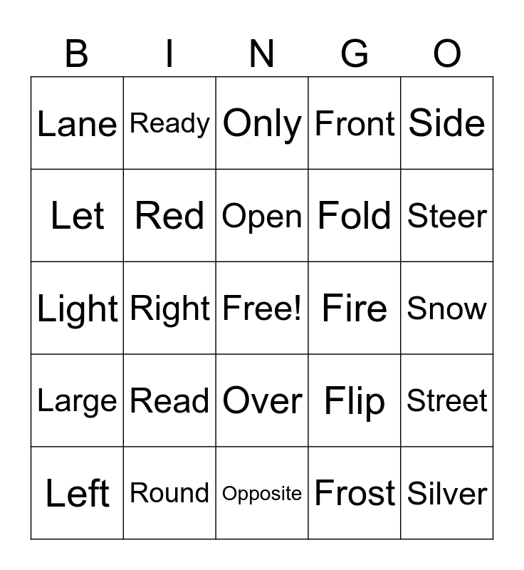 This bingo card has a free space and 24 words: Left, Read, Open, Frost, Side, Lane, Ready, Only, Fire, Snow, Light, Red, Flip, Street, Let, Round, Opposite, Front, Steer, Large, Right, Over, Fold and Silver.