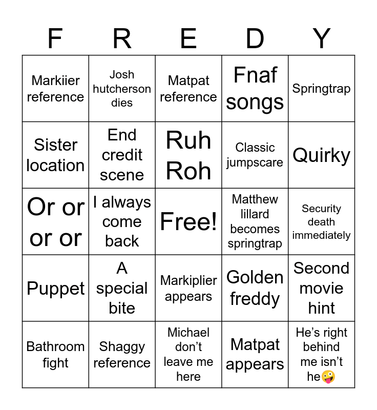 This bingo card has a free space and 24 words: A special bite, Shaggy reference, Ruh Roh, Bathroom fight, Springtrap, Markiier reference, Sister location, Josh hutcherson dies, Matthew lillard becomes springtrap, Markiplier appears, Classic jumpscare, Or or or or, Golden freddy, Second movie hint, End credit scene, Matpat appears, Security death immediately, Matpat reference, Quirky, I always come back, He’s right behind me isn’t he🤪, Puppet, Fnaf songs and Michael don’t leave me here.