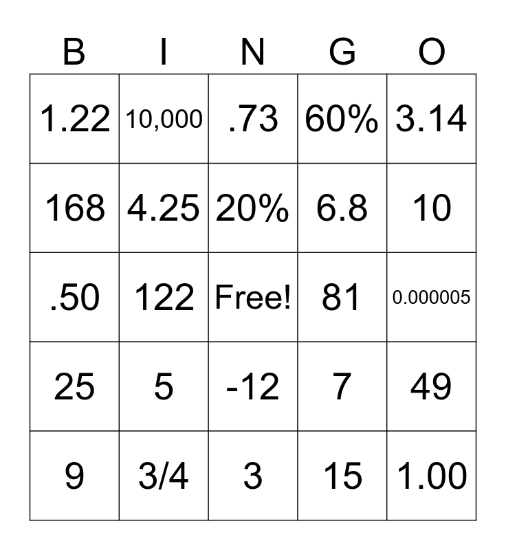 This bingo card has a free space and 24 words: 5, 3/4, 20%, 9, 3.14, 1.22, 168, 10,000, 81, -12, 6.8, .50, 7, 49, 4.25, 15, 0.000005, .73, 10, 122, 1.00, 25, 60% and 3.