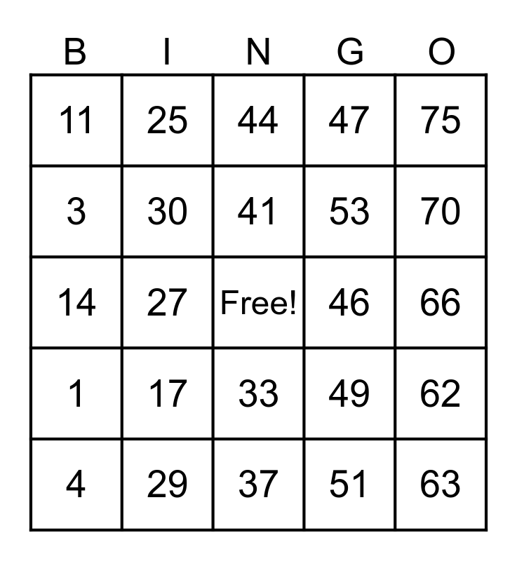 This bingo card has a free space and 24 words: 4, 17, 41, 51, 75, 11, 25, 44, 46, 66, 14, 30, 49, 62, 3, 29, 37, 47, 70, 1, 27, 33, 53 and 63.