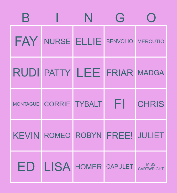 This bingo card has 25 words: ROMEO, HOMER, LEE, ED, MERCUTIO, FAY, RUDI, NURSE, FI, ROBYN, FRIAR, MONTAGUE, FREE!, JULIET, PATTY, MISS CARTWRIGHT, CHRIS, ELLIE, MADGA, CORRIE, TYBALT, LISA, KEVIN, BENVOLIO and CAPULET.