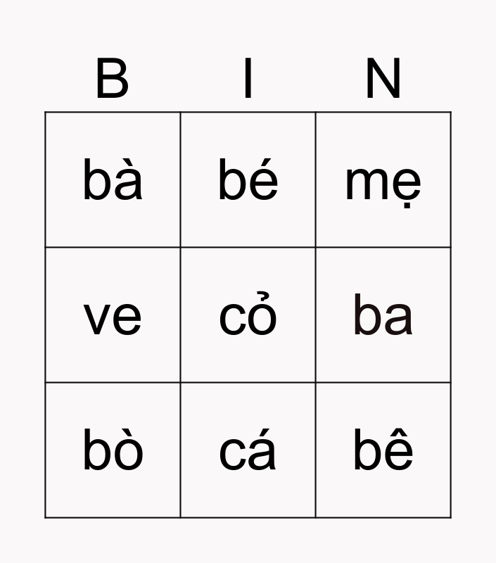 This bingo card has a free space and 8 words: ba, mẹ, bé, bò, bà, bê, ve and cá.