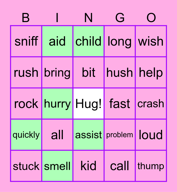 This bingo card has a free space and 24 words: all, smell, bit, stuck, wish, sniff, rush, aid, fast, assist, hush, rock, problem, loud, bring, call, crash, child, help, hurry, thump, quickly, long and kid.