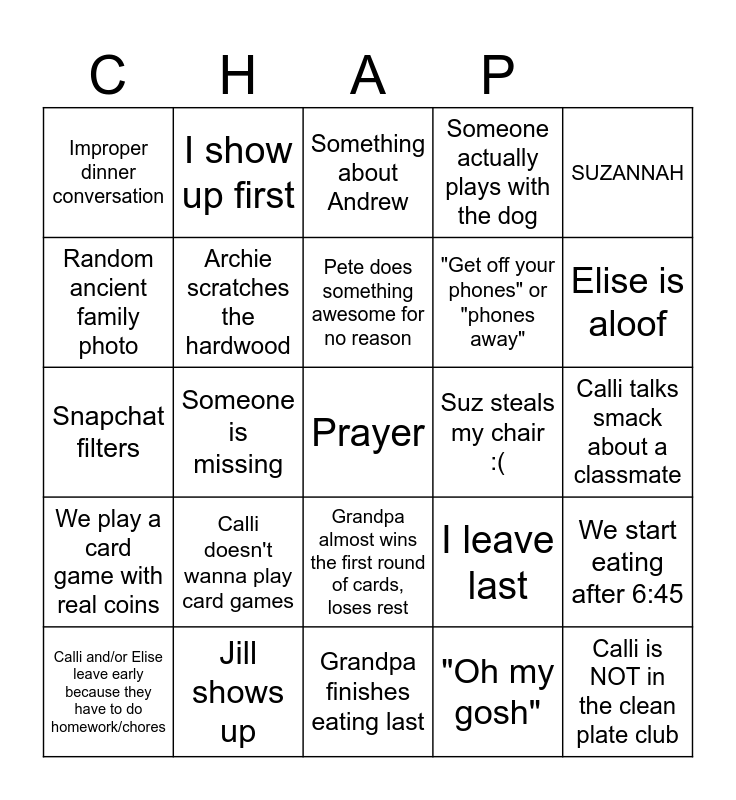 This bingo card has a free space and 24 words: Calli doesn't wanna play card games, Jill shows up, Pete does something awesome for no reason, Calli and/or Elise leave early because they have to do homework/chores, SUZANNAH, Improper dinner conversation, Random ancient family photo, I show up first, Suz steals my chair :(, Grandpa almost wins the first round of cards, loses rest, "Get off your phones" or "phones away", Snapchat filters, I leave last, We start eating after 6:45, Archie scratches the hardwood, "Oh my gosh", Calli talks smack about a classmate, Something about Andrew, Elise is aloof, Someone is missing, Calli is NOT in the clean plate club, We play a card game with real coins, Someone actually plays with the dog and Grandpa finishes eating last.