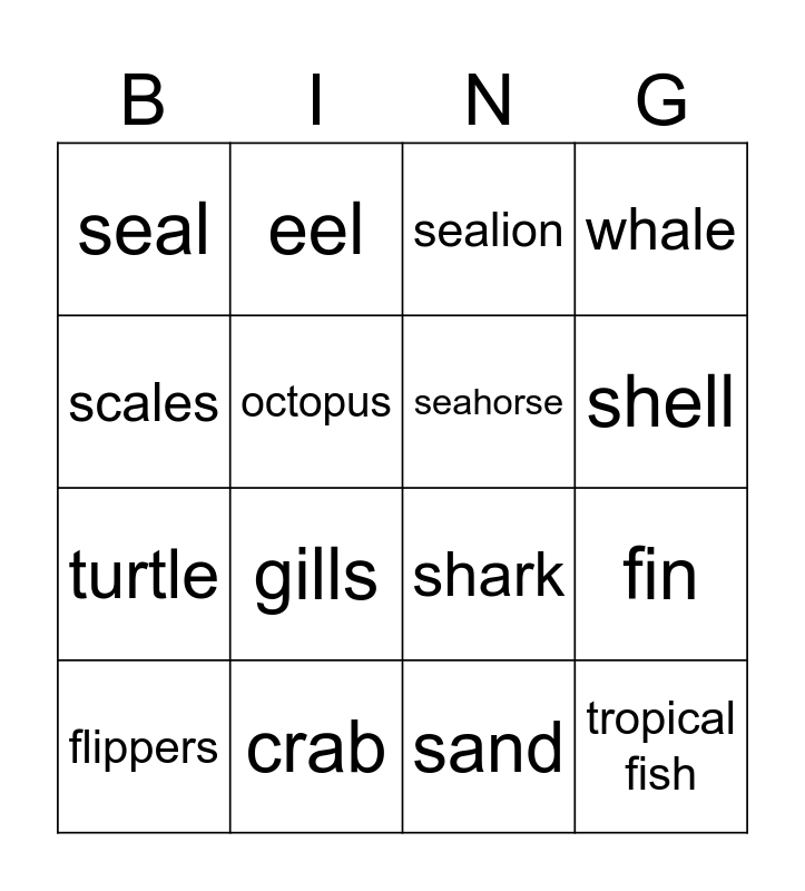 This bingo card has 22 words: crab, dolphin, eel, lobster, octopus, seahorse, seal, sealion, shark, tropical fish, turtle, whale, coral reef, ocean, sand, caves, fin, flippers, gills, scales, shell and tail.