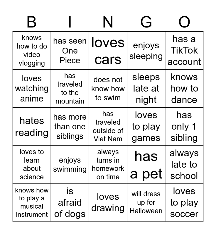 This bingo card has a free space and 24 words: enjoys swimming, is afraid of dogs, does not know how to swim, knows how to play a musical instrument, has a TikTok account, knows how to do video vlogging, loves watching anime, has seen One Piece, loves to play games, always turns in homework on time, sleeps late at night, hates reading, has a pet, always late to school, has traveled to the mountain, will dress up for Halloween, has only 1 sibling, loves cars, knows how to dance, has more than one siblings, loves to play soccer, loves to learn about science, enjoys sleeping and loves drawing.