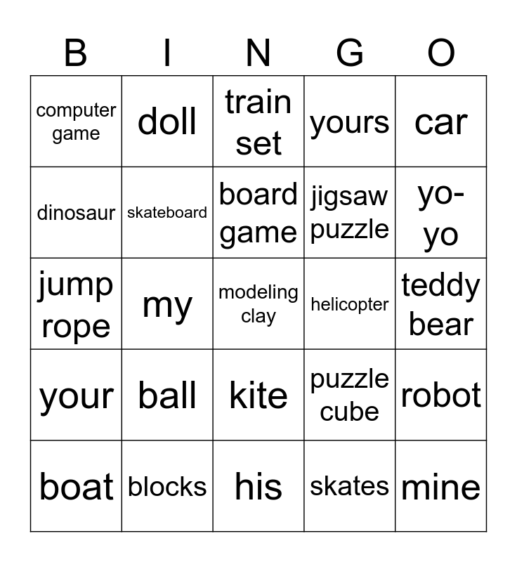 This bingo card has a free space and 24 words: ball, blocks, board game, boat, car, computer game, dinosaur, doll, helicopter, kite, jigsaw puzzle, jump rope, puzzle cube, robot, skateboard, skates, teddy bear, train set, yo-yo, my, mine, your, yours and his.