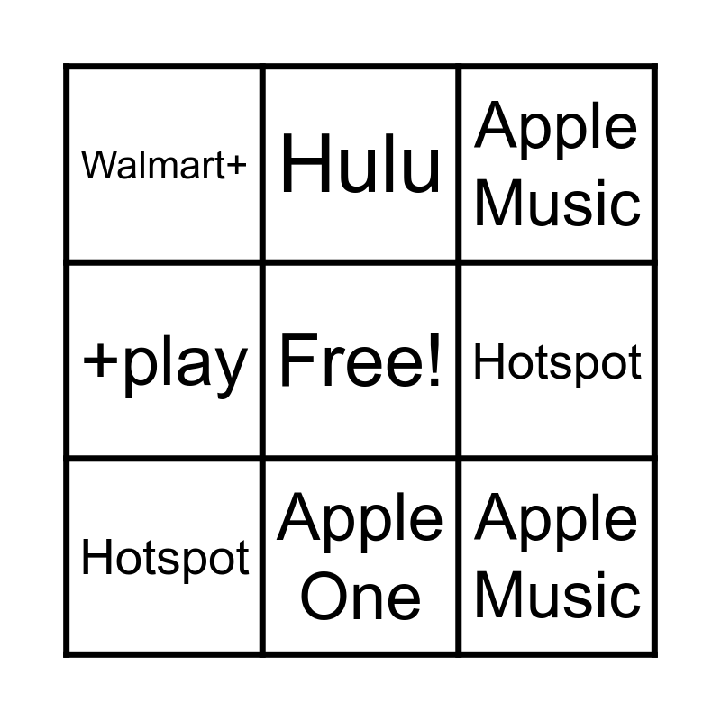 This bingo card has a free space and 8 words: Hotspot, Apple Music, Hulu, Hotspot, Walmart+, Apple Music, +play and Apple One.