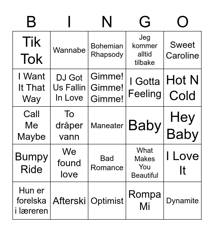 This bingo card has 25 words: We found love, Optimist, Gimme! Gimme! Gimme!, Hun er forelska i læreren, Sweet Caroline, Tik Tok, I Want It That Way, Wannabe, Baby, Bad Romance, I Gotta Feeling, Call Me Maybe, What Makes You Beautiful, I Love It, DJ Got Us Fallin In Love, Dynamite, Hey Baby, Bohemian Rhapsody, Hot N Cold, To dråper vann, Maneater, Afterski, Bumpy Ride, Jeg kommer alltid tilbake and Rompa Mi.