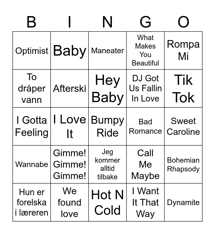 This bingo card has a free space and 24 words: Gimme! Gimme! Gimme!, We found love, Hey Baby, Hun er forelska i læreren, Rompa Mi, Optimist, To dråper vann, Baby, Bad Romance, Jeg kommer alltid tilbake, DJ Got Us Fallin In Love, I Gotta Feeling, Call Me Maybe, Bohemian Rhapsody, Afterski, I Want It That Way, Sweet Caroline, Maneater, Tik Tok, I Love It, Dynamite, Wannabe, What Makes You Beautiful and Hot N Cold.