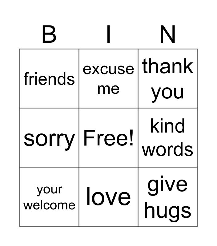 This bingo card has a free space and 9 words: your welcome, thank you, excuse me, sorry, friends, kind words, give hugs, please and love.