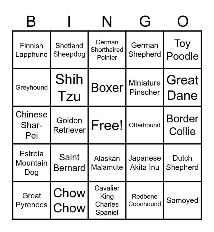 This bingo card has a free space and 90 words: Afghan Hound, Airedale Terrier, Alaskan Malamute, Australian Cattle Dog, Australian Shepherd, Basenji, Basset Hound, Beagle, Belgian Malinois, Bernese Mountain Dog, Bichon Frise, Black & Tan Coonhound, Bloodhound, Border Collie, Boston Terrier, Boxer, Brittany Spaniel, Bull Terrier, Bulldog, Cairn Terrier, Cane Corso, Catahoula Leopard Dog, Cavalier King Charles Spaniel, Chihuahua, Chinese Shar-Pei, Chow Chow, Cocker Spaniel, Collie, Dachshund, Dalmatian, Doberman Pinscher, Dutch Shepherd, English Setter, Estrela Mountain Dog, Finnish Lapphund, German Shepherd, German Shorthaired Pointer, German Wirehaired Pointer, Golden Retriever, Great Dane, Great Pyrenees, Greyhound, Hamiltonstovare, Ibizan Hound, Irish Setter, Japanese Akita Inu, Karelian Bear Dog, Komondor, Labrador Retriever, Lhasa Apso, Mastiff, Miniature Pinscher, Mudi, Newfoundland, Norwegian Elkhound, Old English Sheepdog, Otterhound, Papillon, Parson Russell Terrier, Pekingese, Pembroke Welsh Corgi, Peruvian Inca Orchid, Polish Lowland Sheepdog, Pomeranian, Poodle, Portuguese Water Dog, Pug, Redbone Coonhound, Rhodesian Ridgeback, Rottweiler, Saint Bernard, Samoyed, Scottish Deerhound, Scottish Terrier, Shetland Sheepdog, Shih Tzu, Siberian Husky, Standard Schnauzer, Tibetan Mastiff, Tornjak, Tosa, Toy Poodle, Vizsla, Weimaraner, West Highland White Terrier, Whippet, Working Kelpie, Xoloitzcuintli, Yakutian Laika and Yorkshire Terrier.