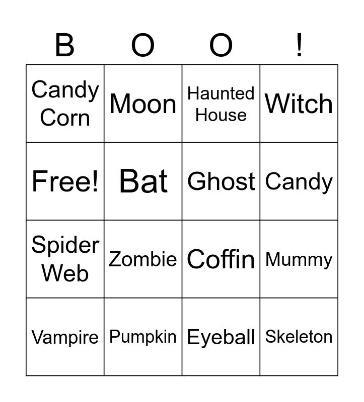 This bingo card has 16 words: Pumpkin, Mummy, Haunted House, Candy Corn, Spider Web, Moon, Coffin, Eyeball, Free!, Bat, Vampire, Witch, Zombie, Candy, Ghost and Skeleton.