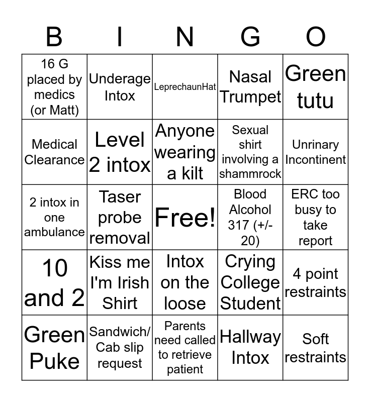 This bingo card has a free space and 24 words: Kiss me I'm Irish Shirt, Sandwich/ Cab slip request, Anyone wearing a kilt, Green Puke, Green tutu, 16 G placed by medics (or Matt), Medical Clearance, Underage Intox, Blood Alcohol 317 (+/- 20), Intox on the loose, Sexual shirt involving a shammrock, 2 intox in one ambulance, Crying College Student, 4 point restraints, Level 2 intox, Hallway Intox, ERC too busy to take report, LeprechaunHat, Unrinary Incontinent, Taser probe removal, Soft restraints, 10 and 2, Nasal Trumpet and Parents need called to retrieve patient.