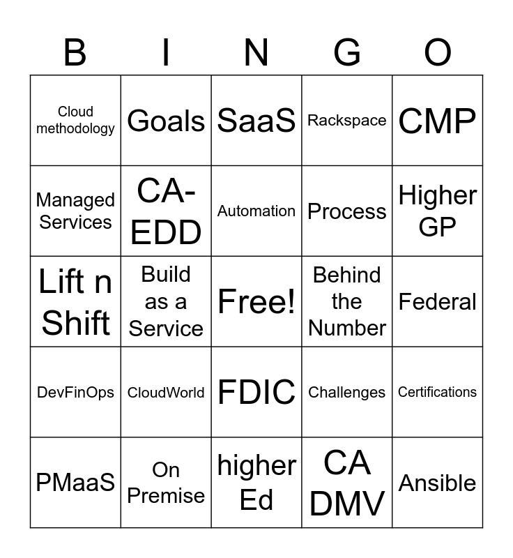 This bingo card has a free space and 24 words: CloudWorld, On Premise, Automation, PMaaS, CMP, Cloud methodology, Managed Services, Goals, Behind the Number, FDIC, Process, Lift n Shift, Challenges, Certifications, CA-EDD, CA DMV, Federal, SaaS, Higher GP, Build as a Service, Ansible, DevFinOps, Rackspace and higher Ed.
