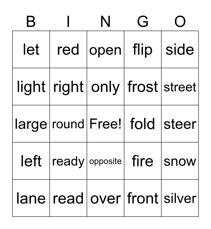 This bingo card has a free space and 24 words: lane, ready, only, front, side, let, red, open, fold, steer, large, right, fire, snow, light, read, over, flip, street, left, round, opposite, frost and silver.