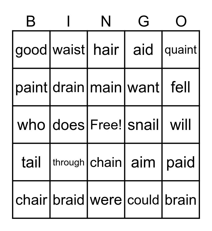 This bingo card has a free space and 24 words: through, braid, main, chair, quaint, good, paint, waist, snail, chain, want, who, aim, paid, drain, could, will, hair, fell, does, brain, tail, aid and were.
