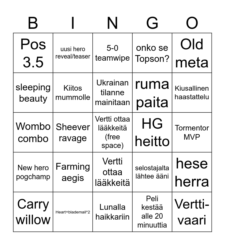 This bingo card has a free space and 29 words: Carry willow, Kuolematon BB, Sheever ravage, Peli kestää yli 60 minuuttia, Pos 3.5, 5-0 teamwipe, Kiitos mummolle, Farming aegis, HG heitto, Heart+blademail*2, Tormentor MVP, Vertti-vaari, Lunalla haikkariin, Peli kestää alle 20 minuuttia, Kiusallinen haastattelu, katsoja postaa cringee, Vertti ottaa lääkkeitä, New hero pogchamp, Old meta, Wombo combo, selostajalta lähtee ääni, "terveisiä kaikille kotiin..", ruma paita, sleeping beauty, onko se Topson?, uusi hero reveal/teaser, hese herra, Ukrainan tilanne mainitaan and eläintarha.