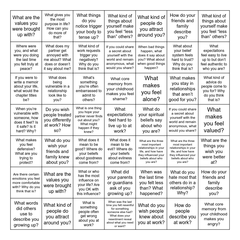This bingo card has 81 words: Free!, What are the values you were brought up with?, What things do you notice trigger your body to tense up?, How do your friends and family describe you?, What do you wish your friends and family knew about you?, What’s something you’re often embarrassed to admit to others?, What are the things you wish you were better at?, If you were to write a memoir about your life, what would the chapter titles be?, What are the three most important relationships in your life, and how have they influenced your beliefs about who you are?, What kind of people do you attract around you?, If you could share a secret about yourself with the world and remain anonymous, what would you share?, Where were you, and what were you doing the last time you felt truly at peace?, What kind of things about yourself make you feel “less than” others?, What are the values you were brought up with?, What things do you notice trigger your body to tense up?, How do your friends and family describe you?, What do you wish your friends and family knew about you?, What’s something you’re often embarrassed to admit to others?, What are the things you wish you were better at?, If you were to write a memoir about your life, what would the chapter titles be?, What are the three most important relationships in your life, and how have they influenced your beliefs about who you are?, What kind of people do you attract around you?, If you could share a secret about yourself with the world and remain anonymous, what would you share?, Where were you, and what were you doing the last time you felt truly at peace?, What kind of things about yourself make you feel “less than” others?, How do people describe you at work?, What is something people often get wrong about you at work?, What do you wish people knew about you at work?, What would you do differently if you could start your career over again?, What kind of responsibilities drain you at work?, What kind of work requests trigger you negatively? Why do you think that is?, What do you wish you could change about your workplace or career?, Do you wish people treated you differently at work? How so?, What expectations feel hard to live up to at work?, What kind of advice do people come to you for? Why do you think that is?, What expectations feel easy to live up to but don’t feel authentic to who you are?, What skill do you think you might have a knack for but don’t try or talk about because you’re afraid of failing?, When you think about what God’s voice or a higher power might sound like, what do you imagine? What does this voice say about you?, What does it mean to be good? Where do your beliefs about goodness come from?, What does it mean to be evil? Where do your beliefs about evilness come from?, What about your belief system feels hard to trust? Why do you think that is?, What do your spiritual beliefs say about who you are?, If you were to question your beliefs, what do you fear others might think about you?, If you have an inner voice, what does it sound like? Is it kind? Critical? Loving? What does it say about you?, When bad things happen, what does it say about you? What about when good things happen?, What or who has the most influence on your life? Are you OK with this influence?, What gives you the most purpose in life? How can you do more of that?, What makes you feel valued?, What does it feel like when someone oversteps your boundaries? What do you do?, How do you wish others would show up for you?, What makes you feel alone?, What makes you stay in relationships that aren’t good for you?, When was the last time you felt less than? What happened?, What triggers bring out the worst in you? Why?, When you put on a mask to show others a specific version of yourself, what part of you are you trying to hide?, Have you ever broken a promise to yourself? What happened? How did it feel?, What’s one thing you wish you could change about your past?, Are there certain emotions you feel more comfortable with? Why do you think that is?, What’s an idea or story that you cling to when you feel like giving up? What does it say about who you are?, What core memory from your childhood makes you angry?, What core memory from your childhood makes you feel shame?, How did your parent or guardian encourage or discourage you growing up?, What words did others use to describe you growing up?, What did you wish people understood about you growing up?, If you could go back to your elementary-school-aged self, what advice would you give?, What do you wish you could change about how you grew up?, What were you most insecure about growing up?, What was your biggest fear growing up?, What’s something you rarely talk about that happened to you as a child?, What did your parents or guardians ask of you growing up?, Name a time when you felt rejected. What happened?, What does being vulnerable in a relationship look like to you?, When you’re vulnerable with someone, how does it feel? Is it safe? Is it hard? Why?, When was the last time you felt jealous? What did you fear might happen? Why?, When was the last time you felt resentful for something someone else had? What does your resentment reveal about what you need or want?, What makes you feel defensive? What are you trying to protect?, What do you hate most that others do in a relationship? Why?, What is one thing you hope your partner never finds out about you? What might happen if they knew?, When was the last time you forgave someone? Was it hard? Why or why not?, What does my partner get annoyed with me about? What does or doesn’t it say about me? and What do you want our partner to believe and know about you?.