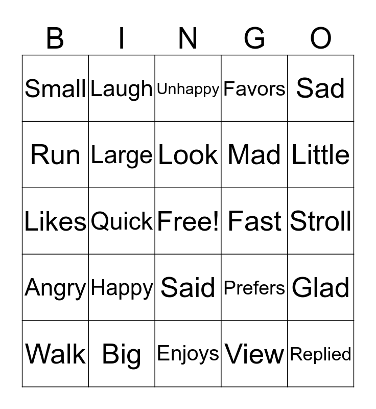 This bingo card has a free space and 24 words: Happy, Big, Look, Walk, Sad, Small, Run, Laugh, Fast, Said, Mad, Likes, Prefers, Glad, Large, View, Stroll, Unhappy, Little, Quick, Replied, Angry, Favors and Enjoys.
