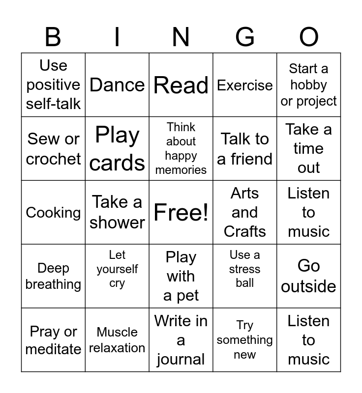 This bingo card has a free space and 24 words: Pray or meditate, Let yourself cry, Think about happy memories, Try something new, Start a hobby or project, Use positive self-talk, Dance, Read, Arts and Crafts, Listen to music, Cooking, Play cards, Use a stress ball, Go outside, Sew or crochet, Muscle relaxation, Write in a journal, Exercise, Take a time out, Deep breathing, Take a shower, Play with a pet, Talk to a friend and Listen to music.