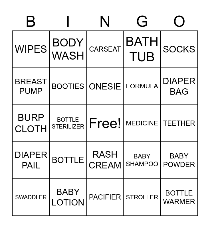 This bingo card has a free space and 25 words: BOTTLE, PACIFIER, ONESIE, SWADDLER, SOCKS, WIPES, BREAST PUMP, BODY WASH, MEDICINE, RASH CREAM, FORMULA, BURP CLOTH, BABY SHAMPOO, BABY POWDER, BOOTIES, CRIB BEDDING, TEETHER, CARSEAT, DIAPER BAG, BOTTLE STERILIZER, BOTTLE WARMER, BABY LOTION, DIAPER PAIL, BATH TUB and STROLLER.