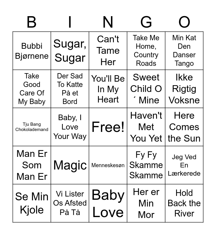 This bingo card has a free space and 31 words: Baby Love, Baby shower bingo, Baby, I Love Your Way, Be My Baby, Bubbi Bjørnene, Can't Tame Her, Der Sad To Katte På et Bord, Fy Fy Skamme Skamme, Haven't Met You Yet, Her er Min Mor, Here Comes the Sun, Hold Back the River, I Love You Baby (ily), Ice Ice Baby, Ikke Rigtig Voksne, Jeg er en Glad Lille Cowboy, Jeg Ved En Lærkerede, Magic, Man Er Som Man Er, Menneskesøn, Min Kat Den Danser Tango, Røde Gummistøvler, Se Min Kjole, Sugar, Sugar, Sweet Child O´ Mine, Take Good Care Of My Baby, Take Me Home, Country Roads, Tju Bang Chokolademand, Vi Lister Os Afsted På Tå, You'll Be In My Heart and You've Got a Friend In Me.