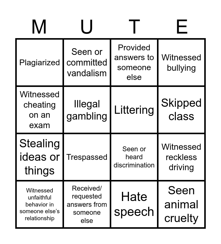This bingo card has 18 words: Witnessed cheating on an exam, Received/ requested answers from someone else, Provided answers to someone else, Witnessed bullying, Stealing ideas or things, Seen or committed vandalism, Seen or heard discrimination, Skipped class, Plagiarized, Trespassed, Hate speech, Witnessed reckless driving, Witnessed unfaithful behavior in someone else’s relationship, Illegal gambling, Littering, Seen animal cruelty, Spread false information about someone and Used a fake ID.
