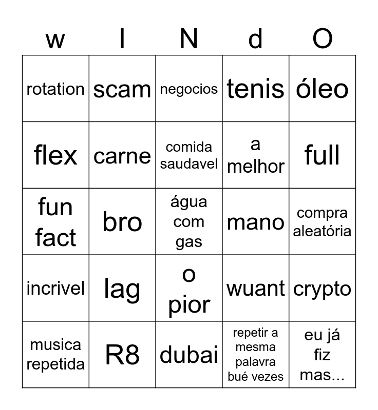 This bingo card has a free space and 24 words: lag, R8, comida saudavel, musica repetida, óleo, rotation, flex, scam, mano, o pior, a melhor, fun fact, wuant, crypto, carne, repetir a mesma palavra bué vezes, compra aleatória, negocios, full, bro, eu já fiz mas..., incrivel, tenis and dubai.