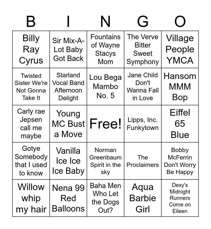 This bingo card has a free space and 50 words: Los Del Rio Macarena, Dexy's Midnight Runners Come on Eileen, Toni Basil Mickey, Baha Men Who Let the Dogs Out?, Vanilla Ice Ice Ice Baby, a-ha Take on Me, Sir Mix-A-Lot Baby Got Back, Van McCoy The Hustle, Twisted Sister We're Not Gonna Take It, Devo Whip It, Starland Vocal Band Afternoon Delight, The Verve Bitter Sweet Symphony, Bobby McFerrin Don't Worry Be Happy, The Proclaimers, Haddaway What Is Love, House of Pain Jump Around, Lou Bega Mambo No. 5, Lipps, Inc. Funkytown, Taco Puttin' on the Ritz, Village People YMCA, Young MC Bust a Move, Aqua Barbie Girl, Billy Ray Cyrus, Jane Child Don't Wanna Fall in Love, Tag Team Whoomp! (There It Is), Axel f Crazy Frog, Hansom MMM Bop, Wheatus Teenage Dirtbag, Fountains of Wayne Stacys Mom, Norman Greenbaum Spirit in the sky, The Buggles Video killed the radio star, Chumbawamba TubThumping, Rednex Cotton Eye Joe, Rick Astley Never gonna give you up, Nena 99 Red Balloons, Tom Cochrane Life is a highway, Ram Jam Black Betty, King Harvest Dancing in the moonlight, Foghat slow ride, Eiffel 65 Blue, Nine Days Story of a girl, James blunt you’re beautiful, Scissor sisters I don’t feel like talking, George Ezra Budapest, Willow whip my hair, Carly rae Jepsen call me maybe, Fun we are young, Baauer harlem shake, Gotye Somebody that I used to know and Ylvis The Fox.