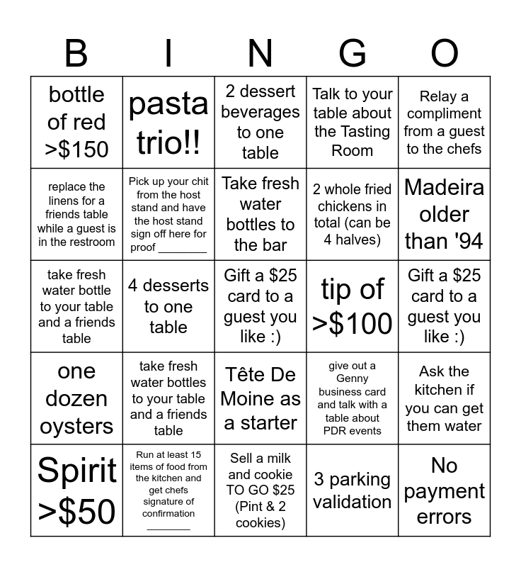 This bingo card has a free space and 29 words: Spirit >$50, Half dozen posters, 4 desserts to one table, caviar upgrade on tartare, bottle of red >$150, 2 dessert beverages to one table, Pick up your chit from the host stand and have the host stand sign off here for proof ________, take fresh water bottles to your table and a friends table, tip of >$100, Run at least 15 items of food from the kitchen and get chefs signature of confirmation ________, Gift a $25 card to a guest you like :), No payment errors, Sell a milk and cookie TO GO $25 (Pint & 2 cookies), 3 parking validation, Madeira older than '94, Fold 50 linens, Tête De Moine as a starter, one dozen oysters, Relay a compliment from a guest to the chefs, take fresh water bottle to your table and a friends table, give out a Genny business card and talk with a table about PDR events, Bottle of bubbles, 2 whole fried chickens in total (can be 4 halves), replace the linens for a friends table while a guest is in the restroom, Talk to your table about the Tasting Room, pasta trio!!, Ask the kitchen if you can get them water, Take fresh water bottles to the bar and bus and reset your table for the next turn.