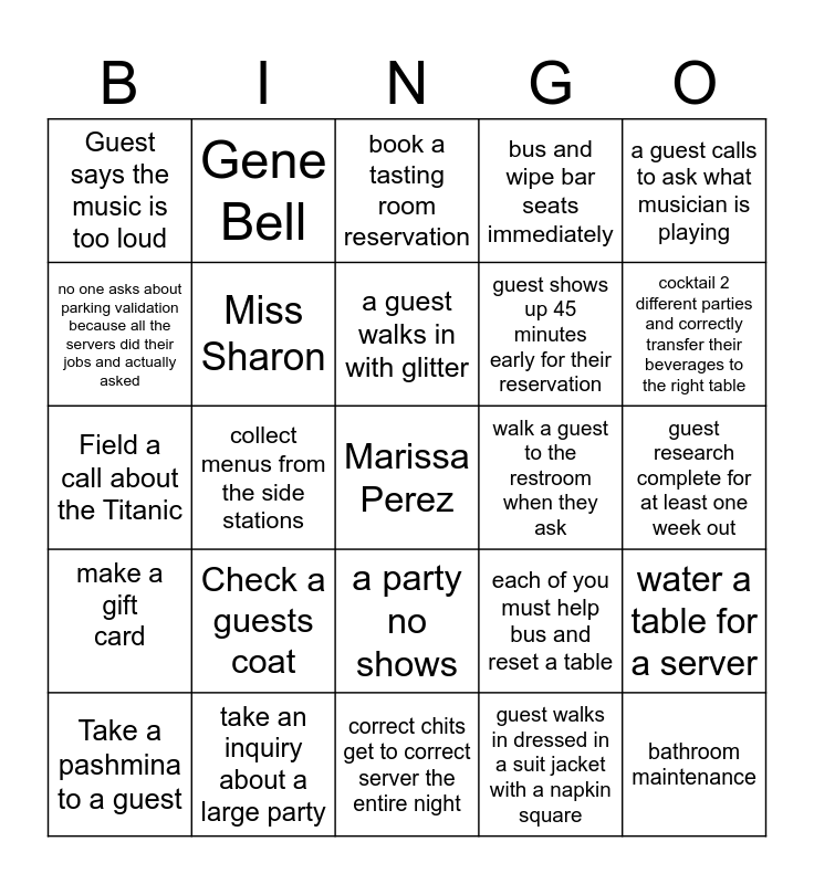 This bingo card has a free space and 24 words: Check a guests coat, take an inquiry about a large party, a guest walks in with glitter, Take a pashmina to a guest, a guest calls to ask what musician is playing, Guest says the music is too loud, no one asks about parking validation because all the servers did their jobs and actually asked, Gene Bell, walk a guest to the restroom when they ask, a party no shows, guest shows up 45 minutes early for their reservation, Field a call about the Titanic, each of you must help bus and reset a table, water a table for a server, Miss Sharon, guest walks in dressed in a suit jacket with a napkin square, guest research complete for at least one week out, book a tasting room reservation, cocktail 2 different parties and correctly transfer their beverages to the right table, collect menus from the side stations, bathroom maintenance, make a gift card, bus and wipe bar seats immediately and correct chits get to correct server the entire night.