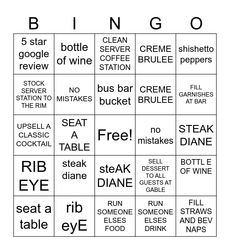 This bingo card has a free space and 24 words: steak diane, rib eyE, bus bar bucket, seat a table, shishetto peppers, 5 star google review, STOCK SERVER STATION TO THE RIM, bottle of wine, no mistakes, steAK DIANE, CREME BRULEE, UPSELL A CLASSIC COCKTAIL, SELL DESSERT TO ALL GUESTS AT GABLE, BOTTL E OF WINE, NO MISTAKES, RUN SOMEONE ELSES DRINK, STEAK DIANE, CLEAN SERVER COFFEE STATION, FILL GARNISHES AT BAR, SEAT A TABLE, FILL STRAWS AND BEV NAPS, RIB EYE, CREME BRULEE and RUN SOMEONE ELSES FOOD.