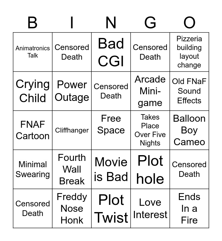 This bingo card has a free space and 29 words: Censored Death, Easter Egg, Cliffhanger, Flashback, Animatronics Talk, Bad CGI, Power Outage, Fourth Wall Break, Takes Place Over Five Nights, Freddy Nose Honk, Balloon Boy Cameo, Ends In a Fire, Plot Twist, Love Interest, Old FNaF Sound Effects, Puppet Appears, Movie is Bad, Minimal Swearing, Pizzeria building layout change, FNAF Cartoon, Plot hole, Scott C.Cameo, Arcade Mini-game, Crying Child, Censored Death, Censored Death, Censored Death, Censored Death and Censored Death.