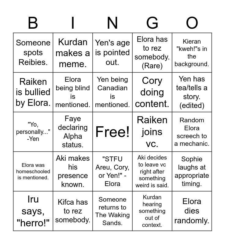 This bingo card has a free space and 32 words: Kurdan hearing something out of context., Kifca or Areu being muted., Faye declaring Alpha status., Areu cackling., Elora was homeschooled is mentioned., Elora being blind is mentioned., Kieran "kweh!"s in the background., Sophie laughs at appropriate timing., Kurdan makes a meme., Elora is quoted in the whose line channel., Yen being Canadian is mentioned., Yen's age is pointed out., Yen teleport blocks., Kei simping over her dragon boy., Raiken joins vc., Raiken is clueless on topic., Iru says, "herro!", "Yo, personally..." -Yen, "STFU Areu, Cory, or Yen!" -Elora, Aki makes his presence known., Aki decides to leave vc right after something weird is said., Areu turns something into an innuendo., Random Elora screech to a mechanic., Kifca has to rez somebody., Elora dies randomly., Elora has to rez somebody. (Rare), Cory doing content., Raiken is bullied by Elora., Someone spots Reibies., Someone returns to The Waking Sands., Someone does a Locke impression. and Yen has tea/tells a story. (edited).