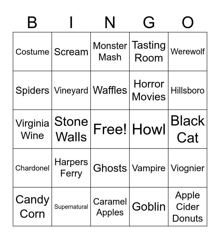 This bingo card has a free space and 54 words: Cab Franc, Chardonel, Pumpkins, Gourds, Ghosts, Manor House, Tasting Room, Corn maze, Spiders, Bobbing for Apples, Costume, Magic, Supernatural, Candy Corn, Haunted House, Caramel Apples, Apple Cider Donuts, Horror Movies, Jack 0’Lantern, Black Cat, Vampire, Ghoul, Howl, Werewolf, Graveyard, Scream, Mummy, Monster, Zombie, Goblin, Tombstone, Spider Web, Coffin, Ravens, Monster Mash, October, Virginia Wine, Viognier, Teresa, Vineyard, Winemaker, Grape Vines, Trellis, Loudoun, Harpers Ferry, 1840's, Hilltop, Wobble, Waffles, Stone Walls, Hillsboro, Wine Club, Chambourcin and LoCo Fest.