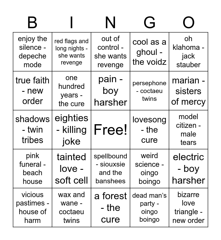 This bingo card has a free space and 31 words: vicious pastimes - house of harm, face meets glass - actors, pain - boy harsher, body electric - sisters of mercy, oh klahoma - jack stauber, enjoy the silence - depeche mode, one hundred years - the cure, spellbound - siouxsie and the banshees, persephone - coctaeu twins, tear you apart - she wants revenge, pink funeral - beach house, eighties - killing joke, stay - oingo boingo, dead man’s party - oingo boingo, electric - boy harsher, goodbye horses - Q lazzarus, tainted love - soft cell, a forest - the cure, lovesong - the cure, bizarre love triangle - new order, true faith - new order, wax and wane - coctaeu twins, love will tear us apart - joy division, cool as a ghoul - the voidz, model citizen - male tears, shadows - twin tribes, red flags and long nights - she wants revenge, out of control - she wants revenge, weird science - oingo boingo, marian - sisters of mercy and kiss me until my lips fall off - lebanon hanover.